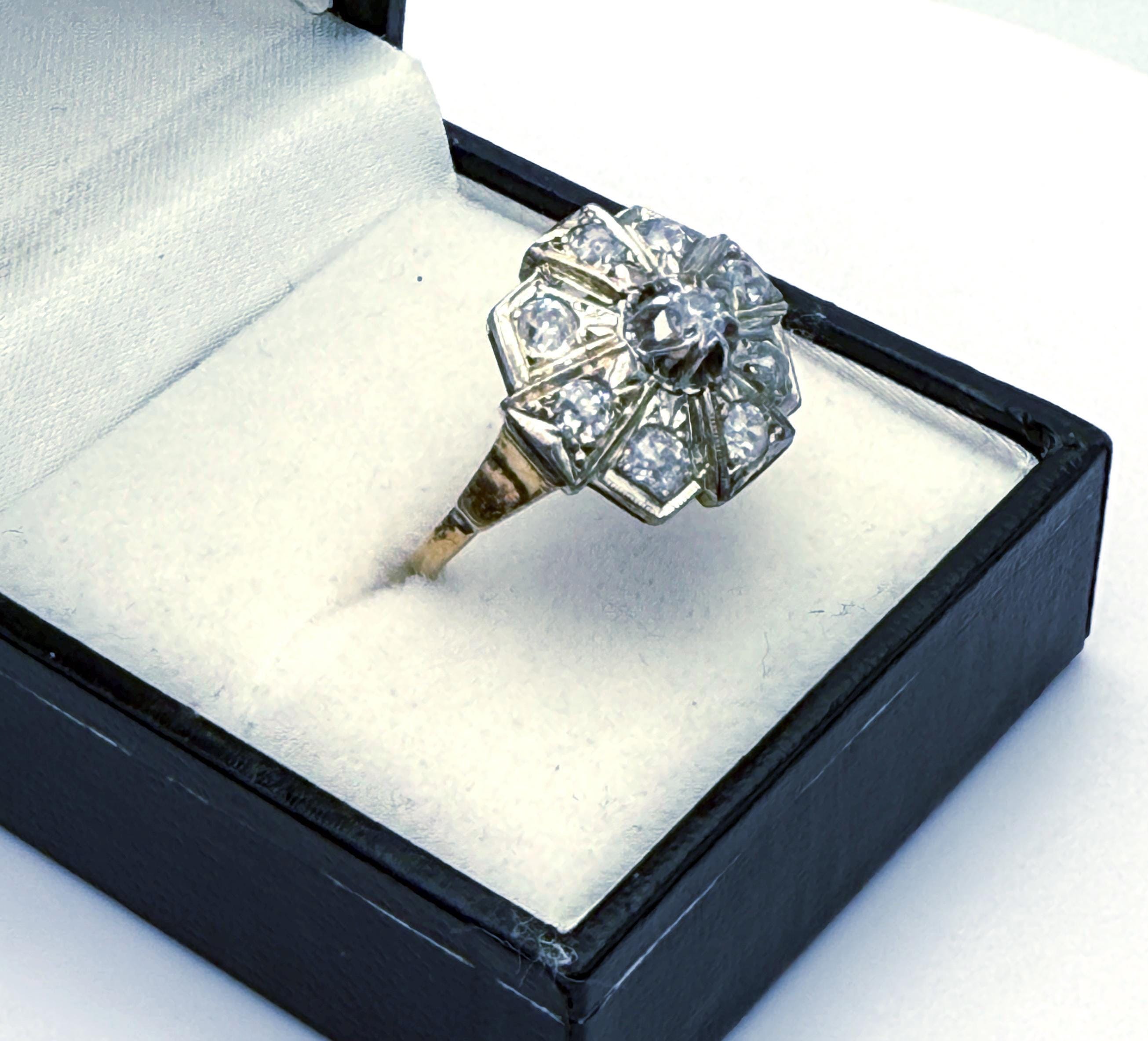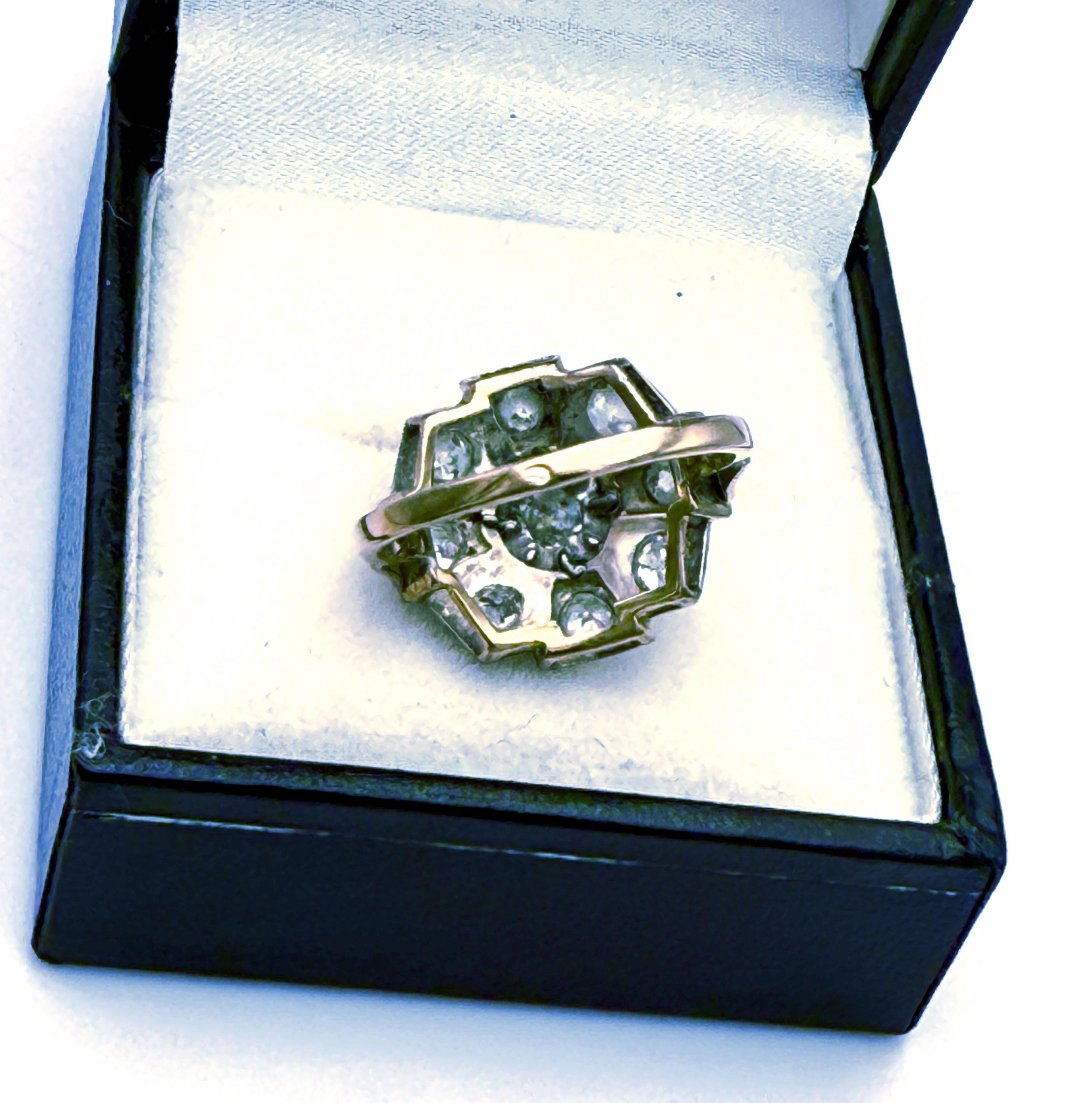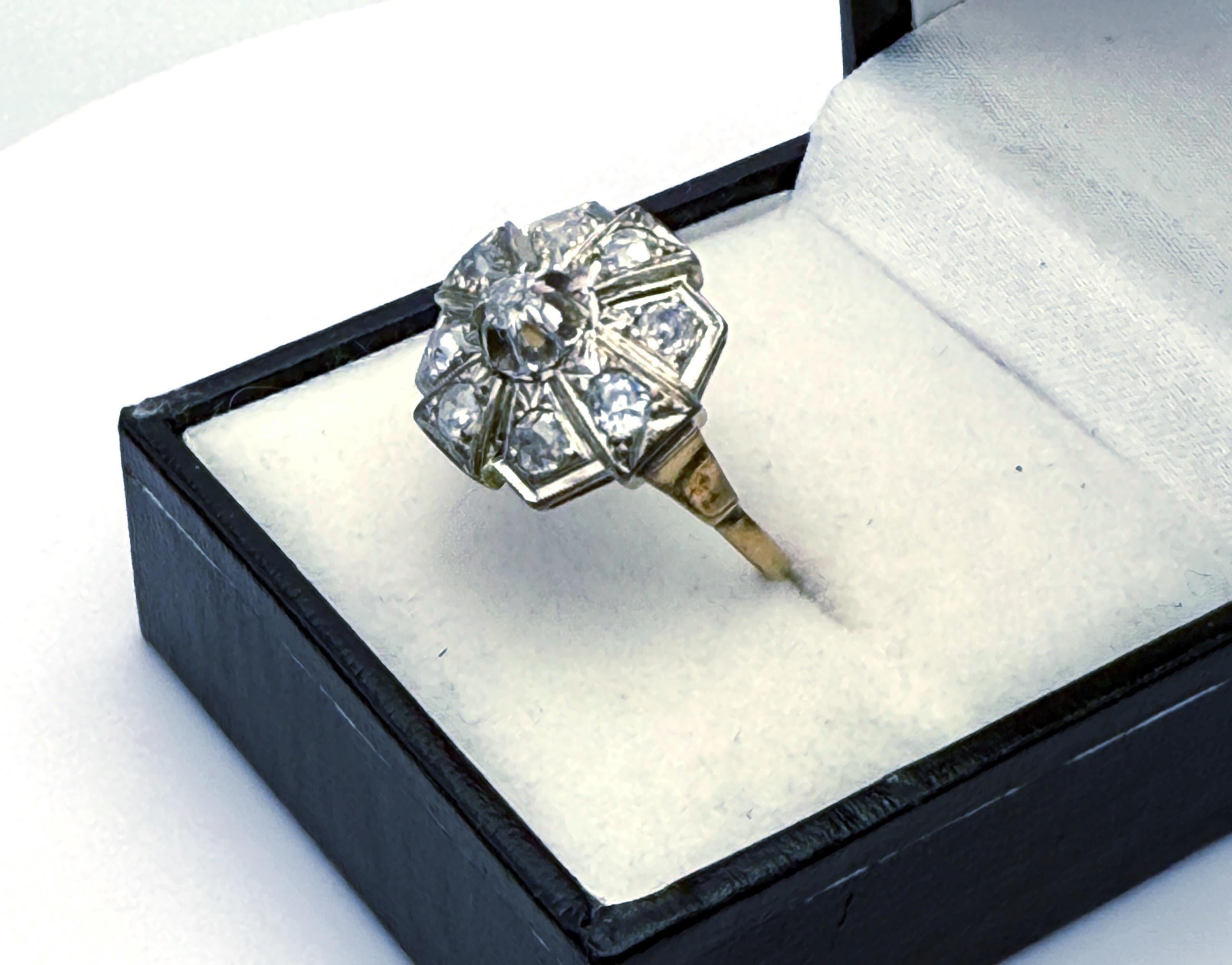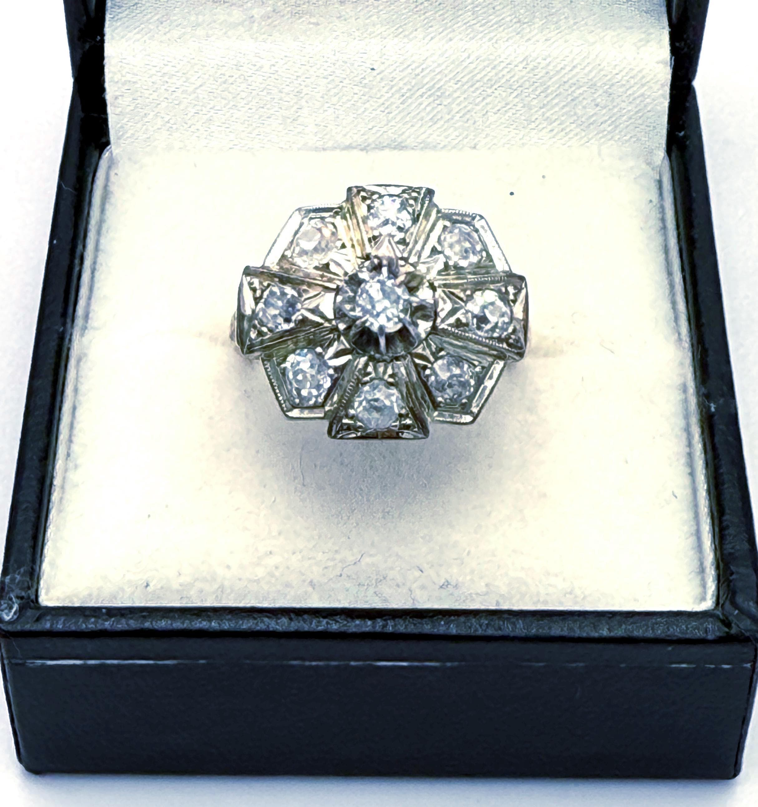 The top is of octogonal shape, typical of the art deco era, and encrusted with 9 old mine cut diamonds