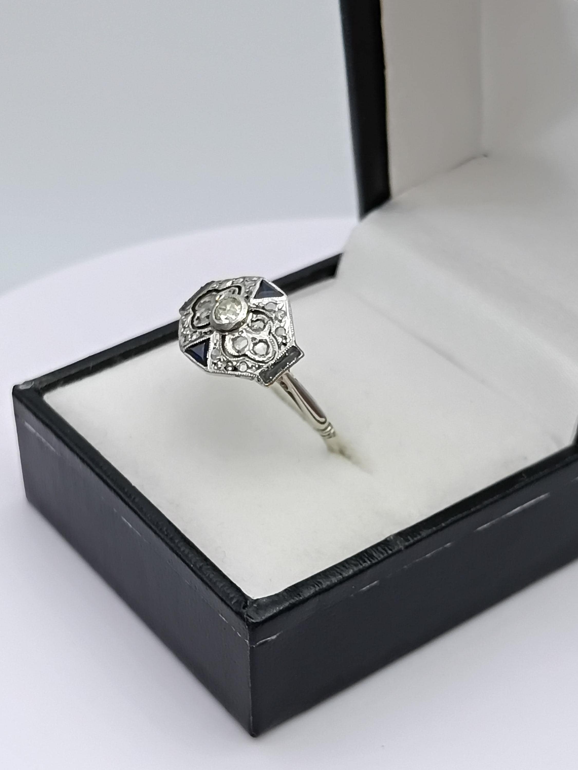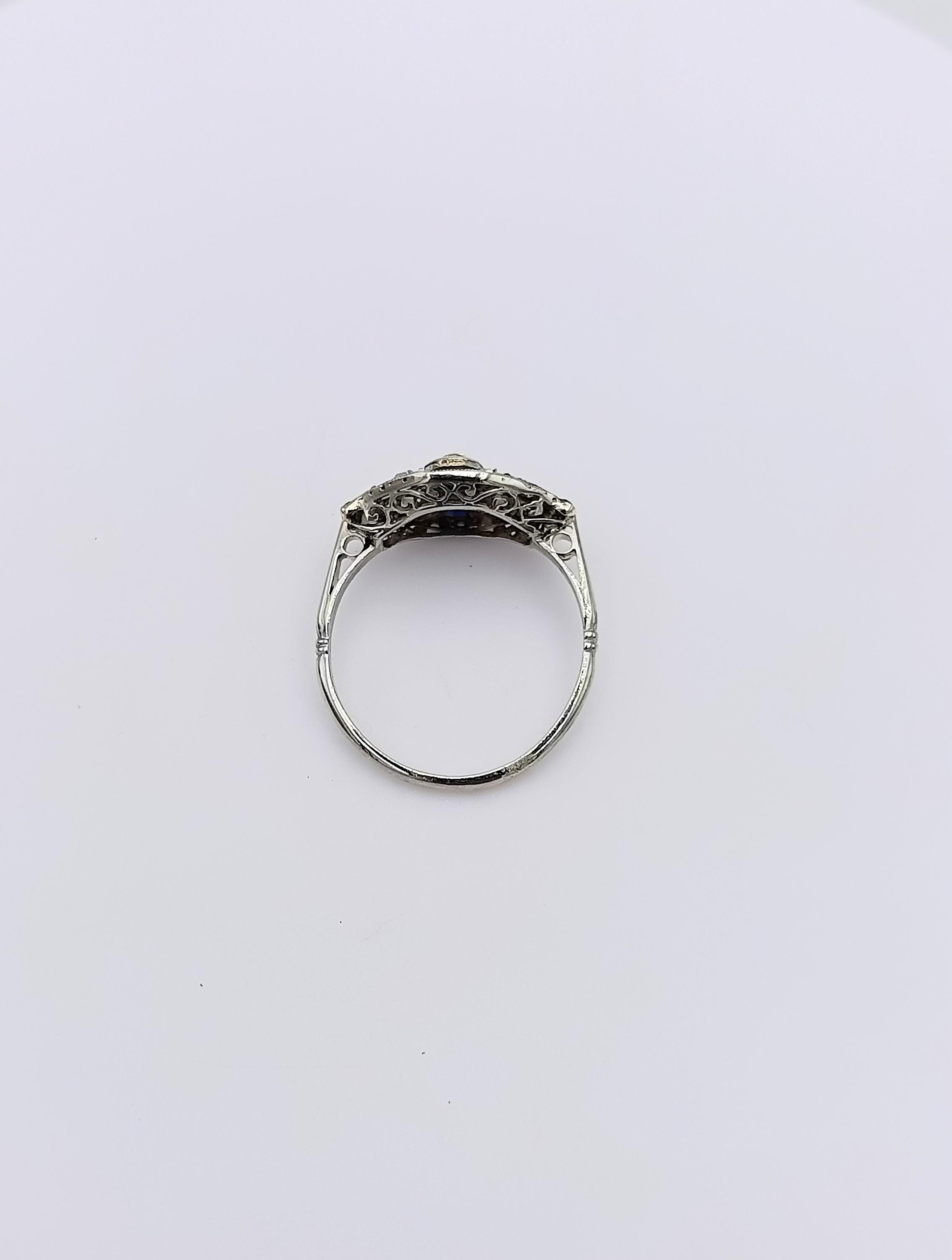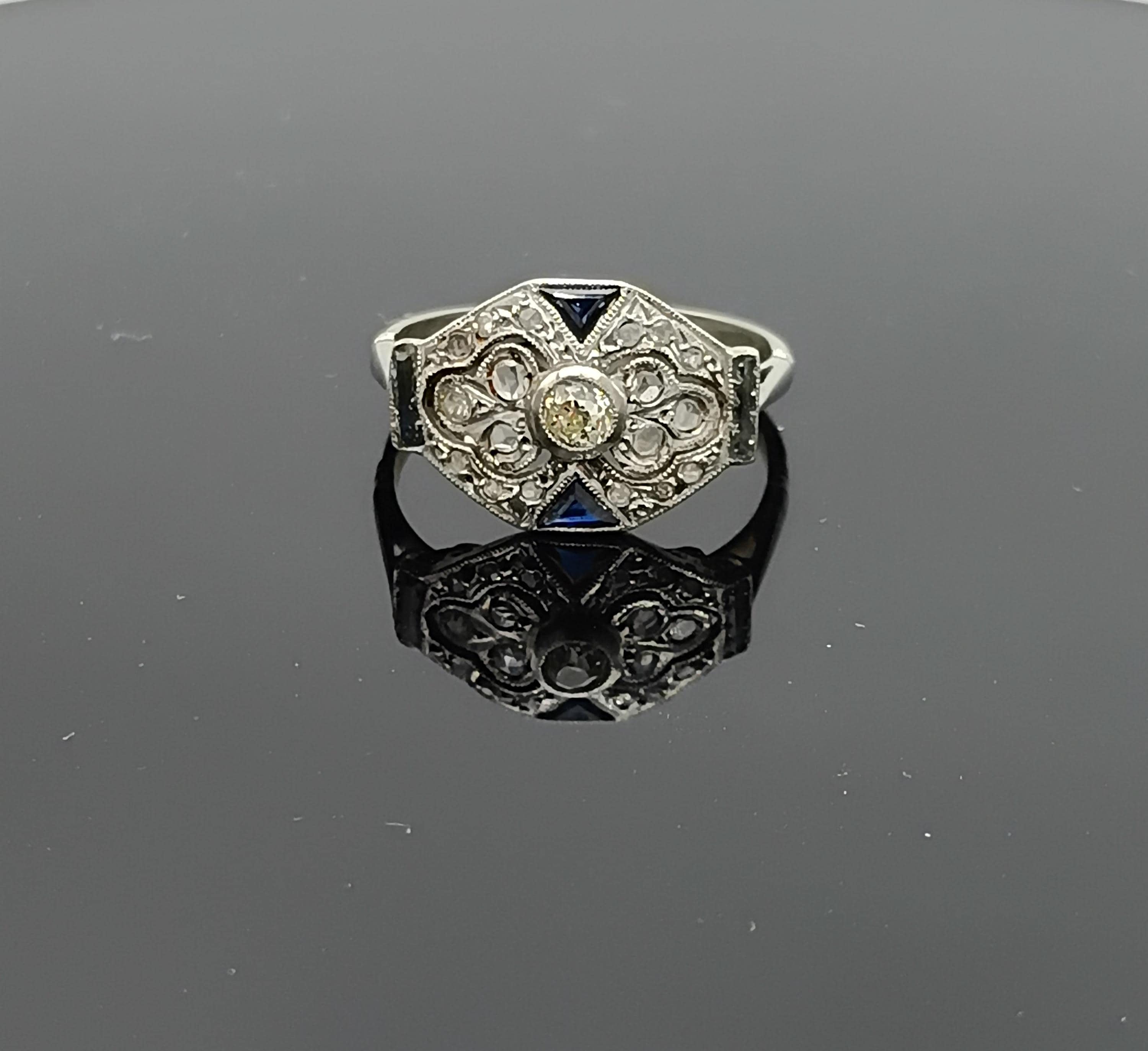 Authentic Art deco 18K white gold ring set with diamond and sapphire