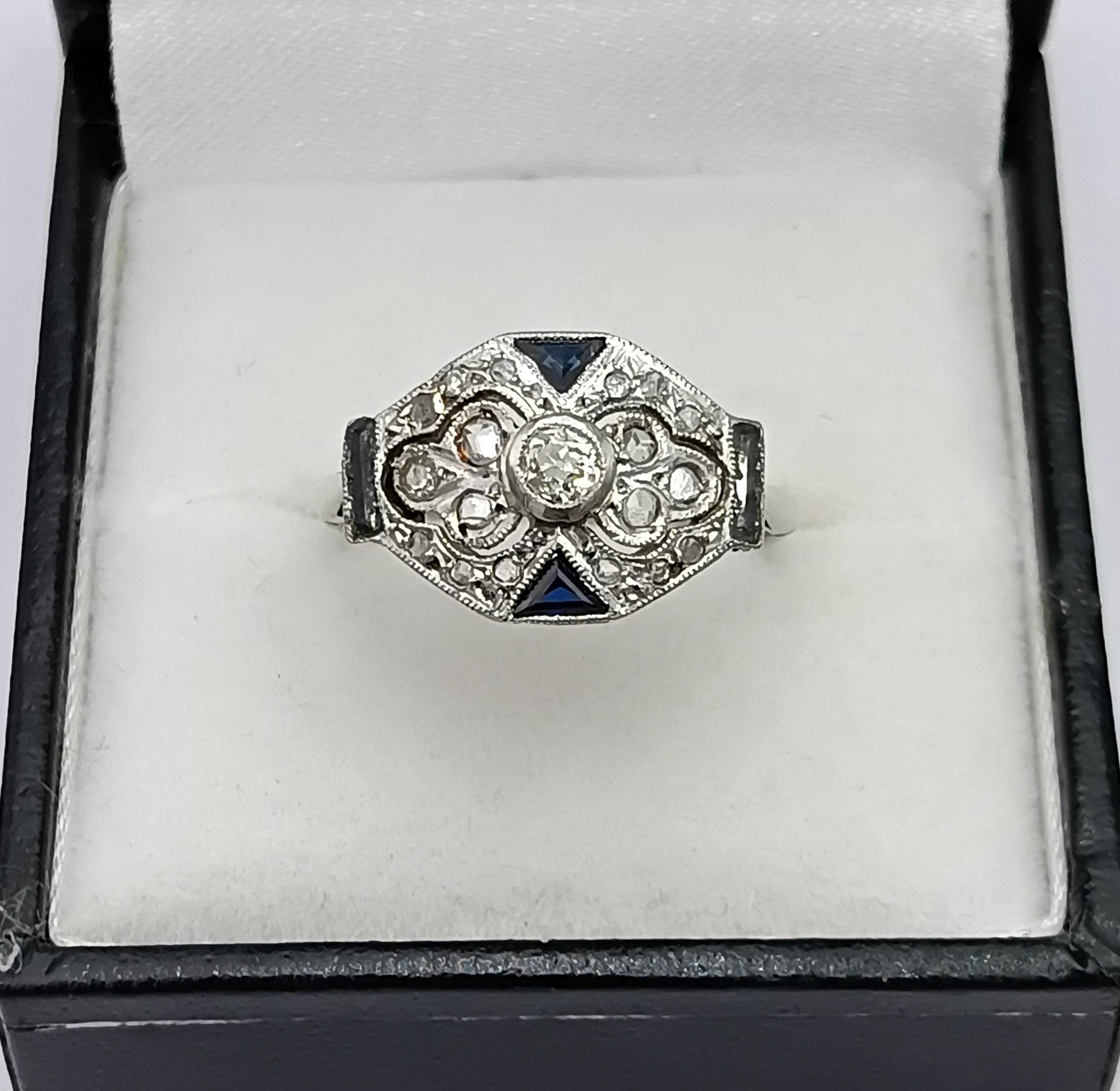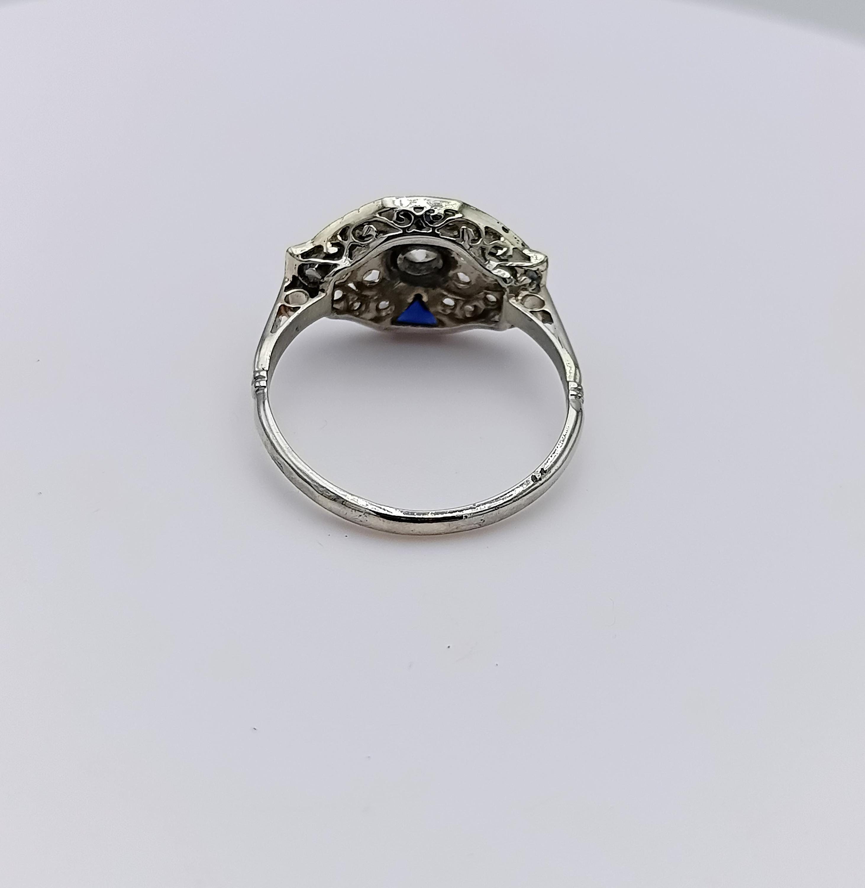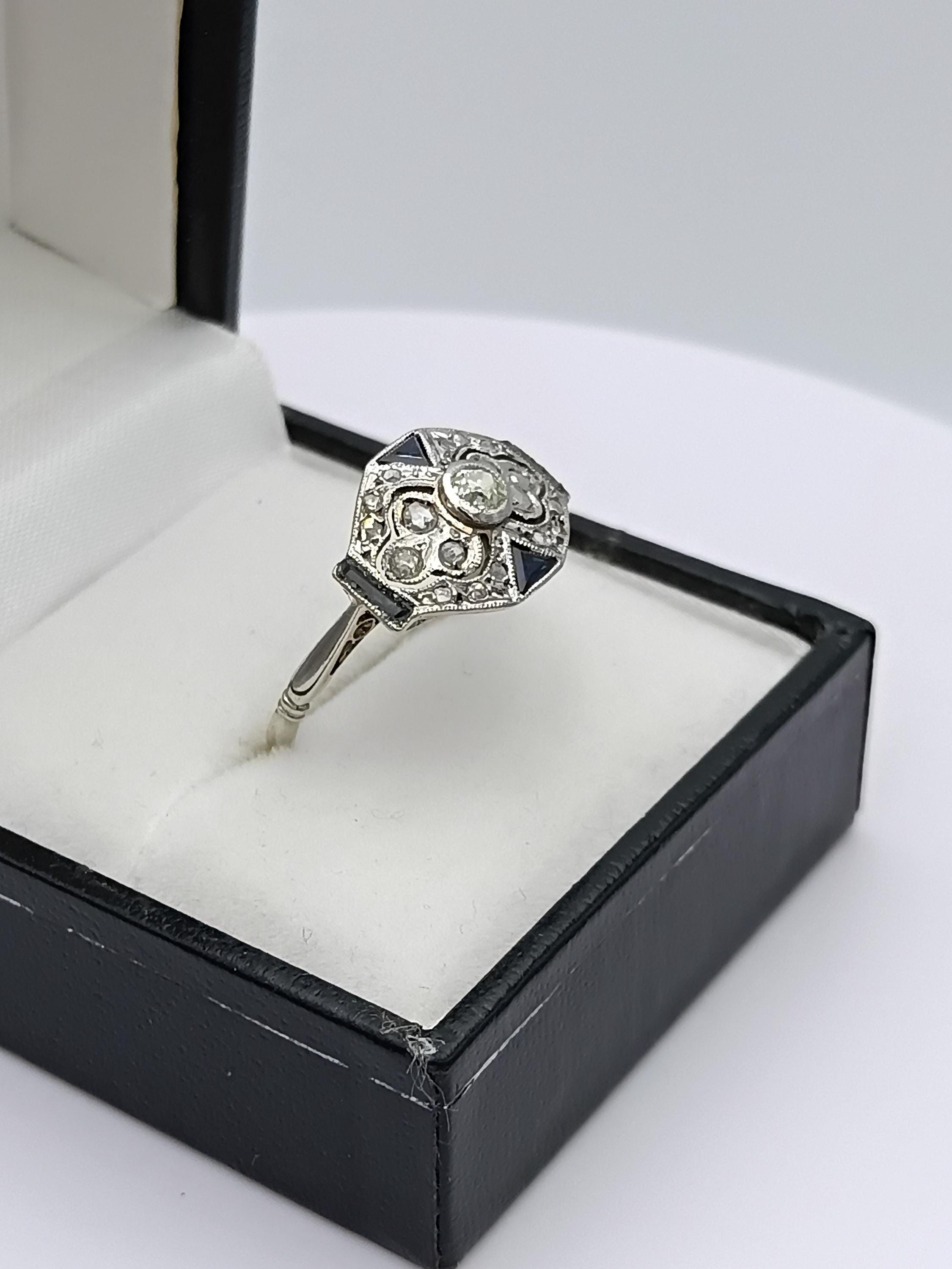 Authentic Art deco 18K white gold ring set with diamond and sapphire